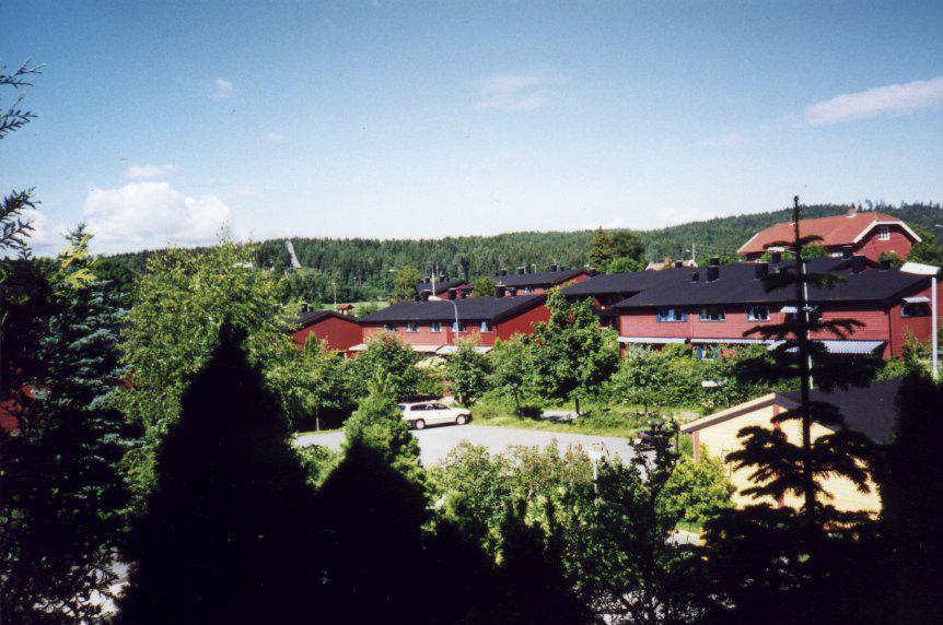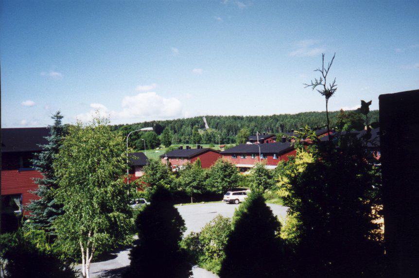 In de verte zie je een skischans. Eigenlijk zijn er drie skischanzen vlak naast elkaar. Degene die je ziet is de hoogste. Benieuwd naar het uitzicht op de schans?