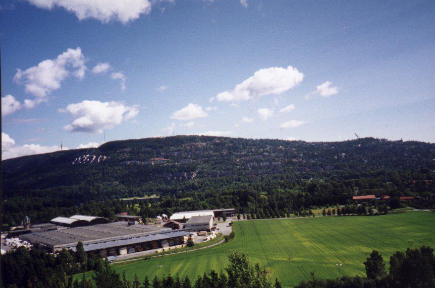 Een stukje van de houtverwerkingsindustrie. De bebouwing recht daarboven zijn de duurste appartementen van Oslo. Prachtig uitzicht over de marka... Rechtboven het rode dak is de Holmenkollen-schans weer zichtbaar.